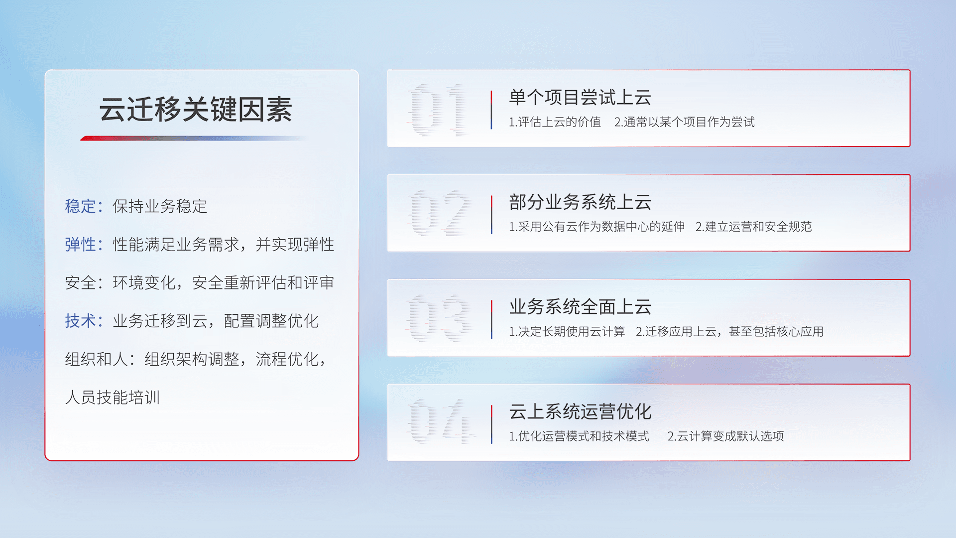 结合实际业务,,从规划设计、、云平台选型、、、、云原生改造、、数据迁移、、集成交付,,,,迁移全过程为客户识别最佳上云路径,,,,做好风险识别管理,,,,设计网络架构、、身份权限、、、安全审计合规、、、、操作审计、、、、日志审计、、、监控告警策略、、、多站点容灾设计等,,对云上基础设施进行整体规划,,,提升IT治理水平,,以满足弹性、、高可用、、、、高性能的需求。。