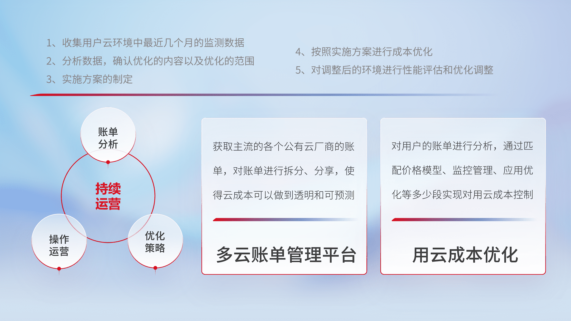 通过多云纳管,,以统一的资源数据模型把客户的云资源进行抽象和封装,,进而实现对多云资源的统一操作,,,,保障云资源管理的可靠性、、、、稳定性与可用性。。。。量身定制化运维内容,,,配置、、、开发运维、、补丁管理、、、、备份、、、监控、、认证和访问管理、、、审计和日常巡检等,,,,保障在用云过程中的可靠度,,,,稳定度以及高可用率。。